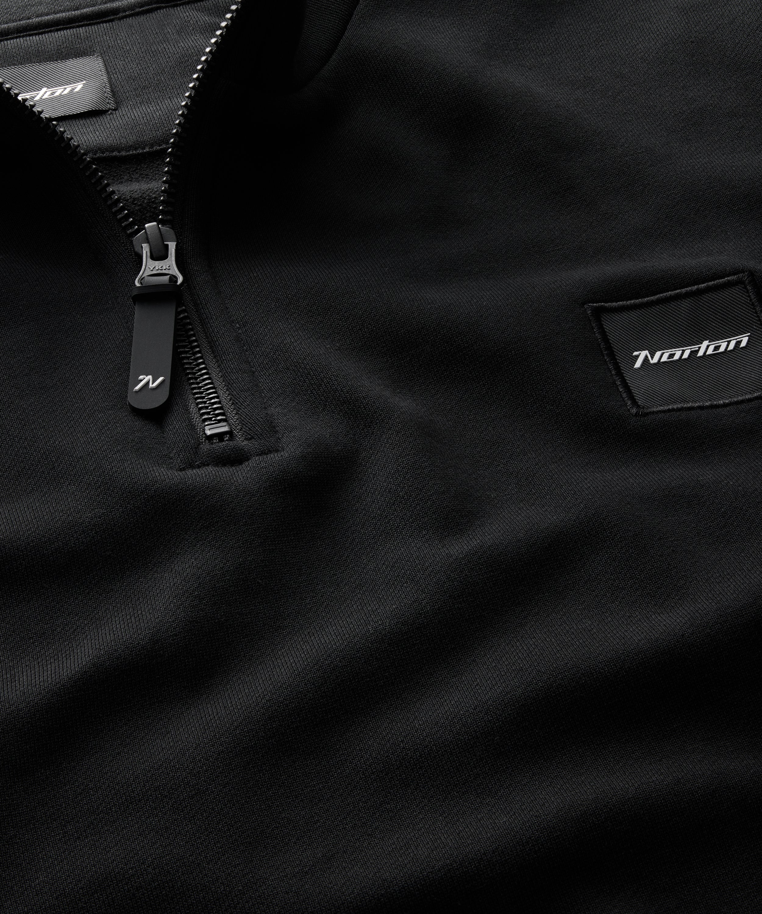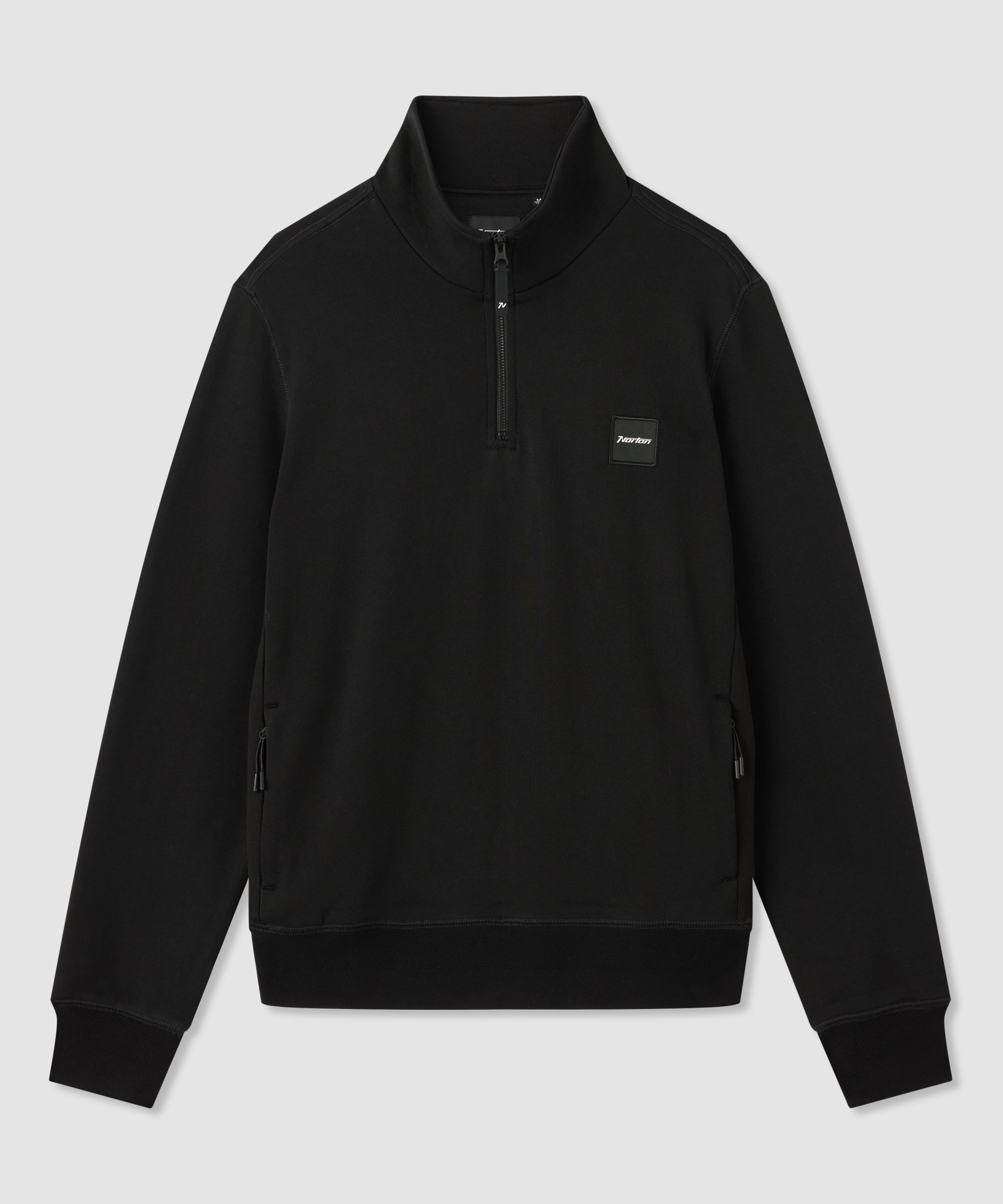 Dieser schwarze Sweatshirt für Herren mit 1/4-Reißverschluss ist auf alltägliche Vielseitigkeit ausgelegt. Mit zwei Seitentaschen und einem strukturierten Rippenabschluss an Ärmeln und Saum ausgestattet, sorgt der YKK-Reißverschluss für zuverlässigen Einsatz. Dezente Norton-Details runden das Modell sauber und bedacht ab.