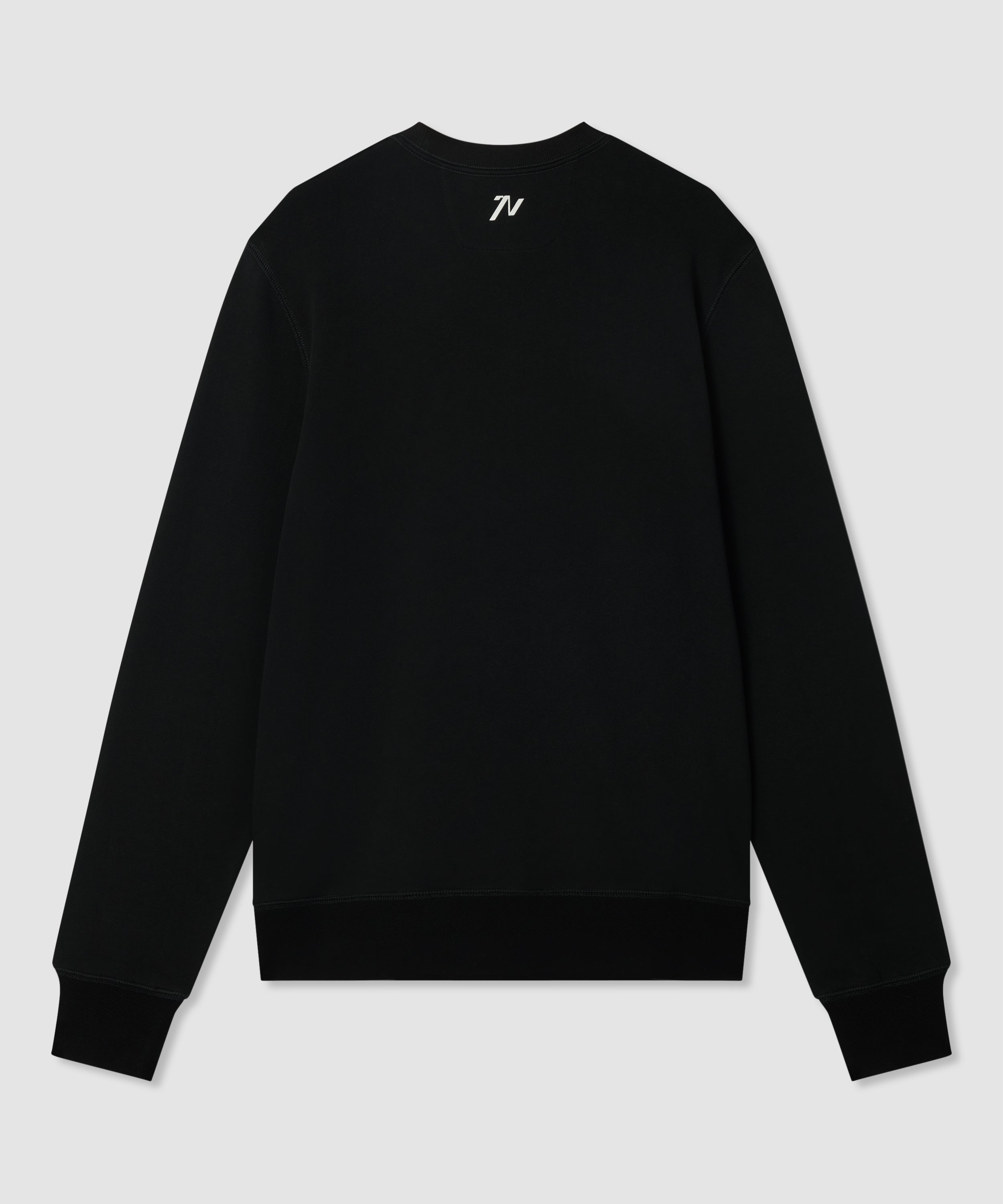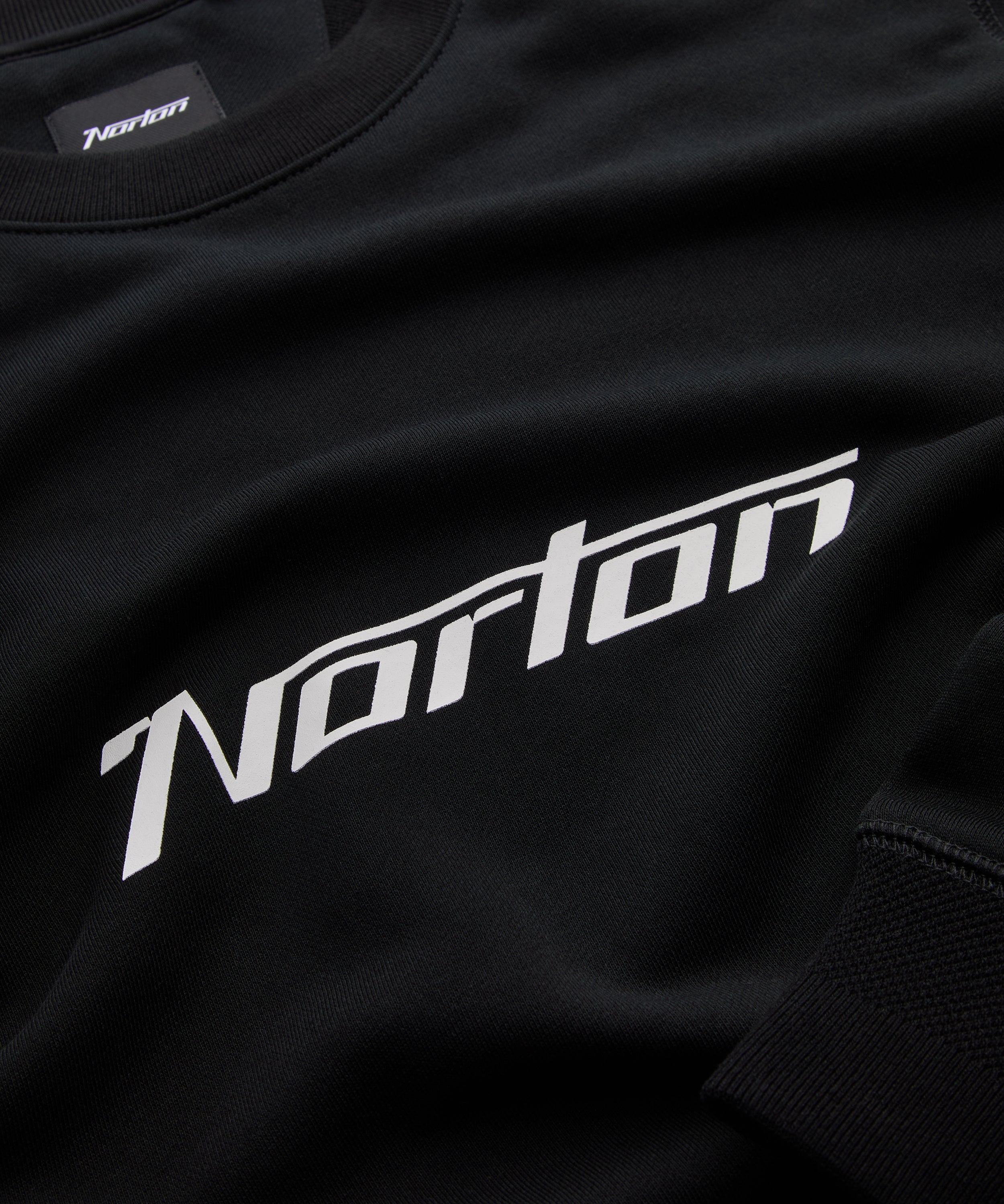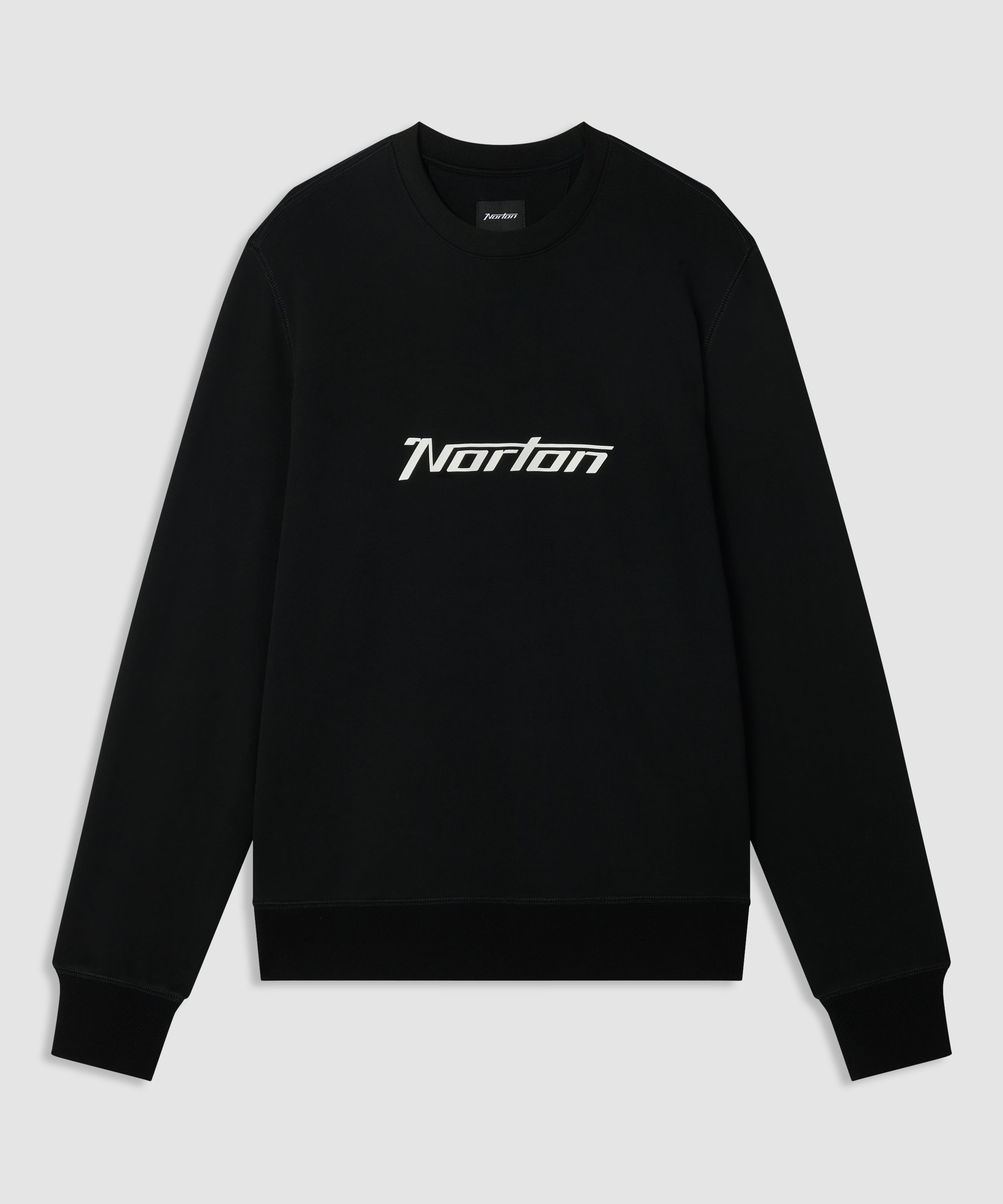 Ein schwarzes Jersey-Sweatshirt mit Rundhalsausschnitt für Herren, mit einem im Siebdruck aufgebrachten Norton-Logo auf der Brust. Dezente Norton-Details setzen einen stillen Akzent und vollenden ein Modell, das auf Klarheit statt Überfluss setzt.