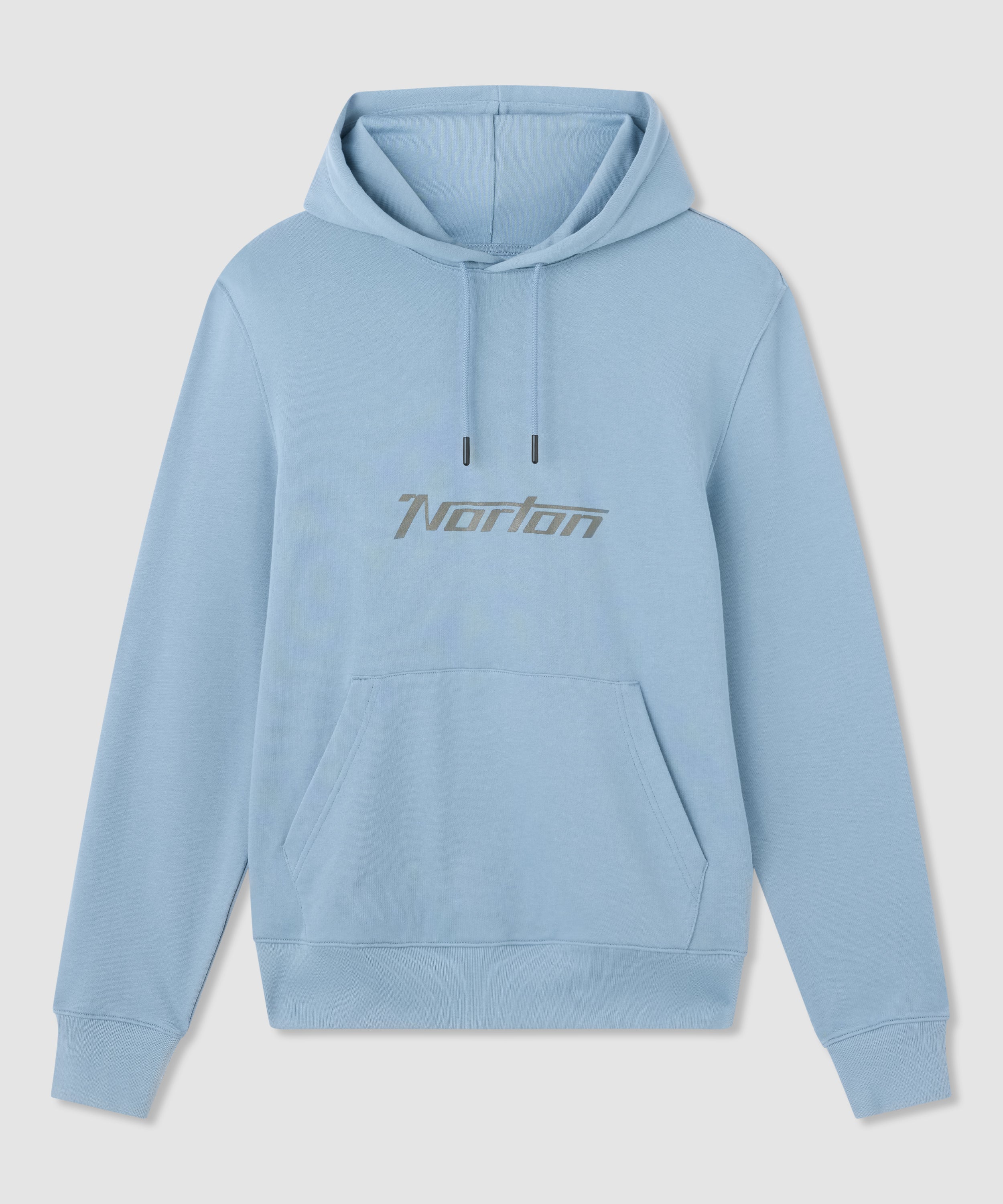 Dieses blaue Jersey-Hoodie für Herren konzentriert sich auf das Wesentliche. Ein im Siebdruck aufgebrachtes Norton-Logo prägt die Brust, ergänzt durch eine Kängurutasche vorne für den Alltag. Dezente Norton-Details verleihen dem Modell eine klare, durchdachte Note.
