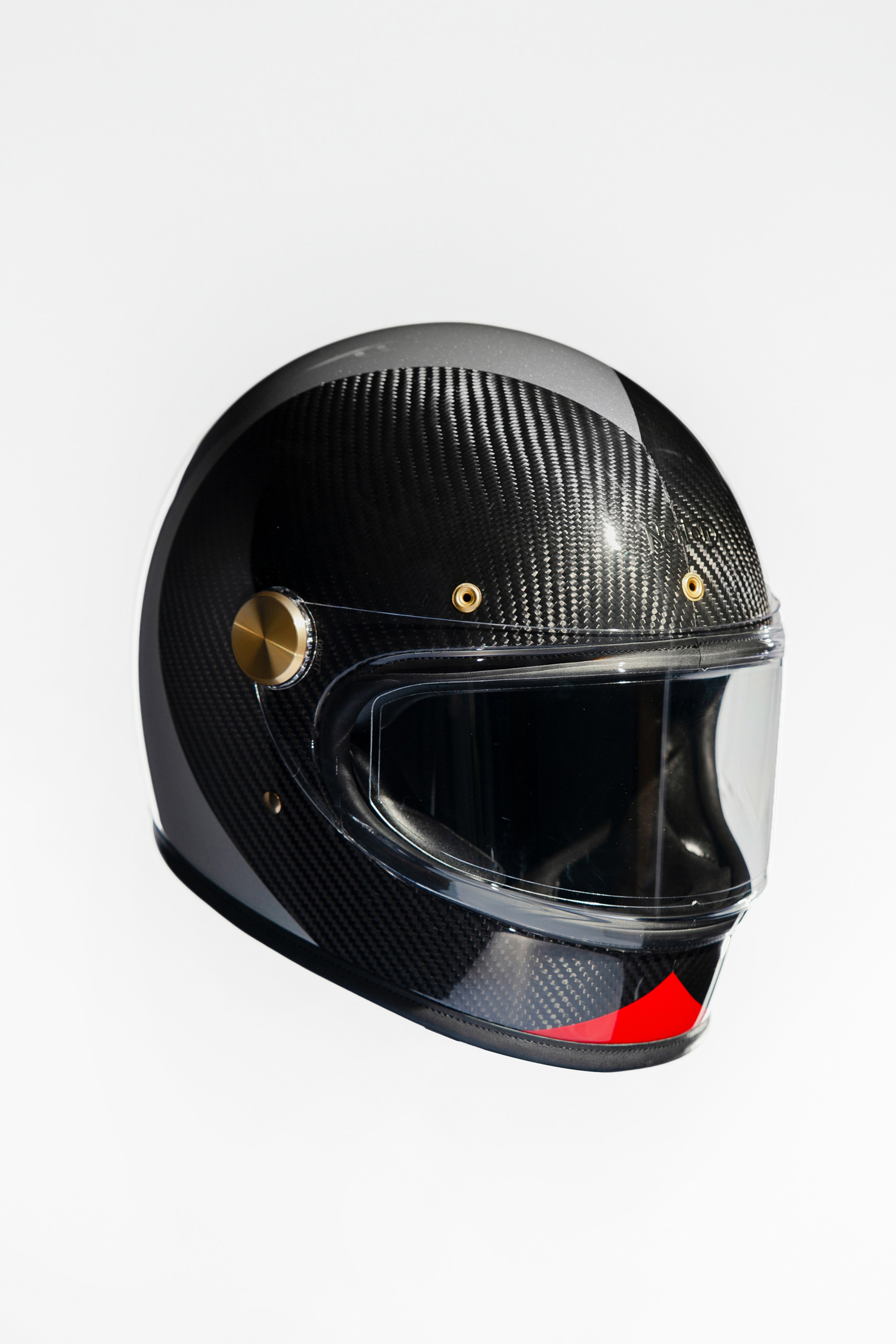 This helmet is made of full carbon fibre with platinum and red motifs. It is accented with gold brass hardware for that extra touch of refinement and is trimmed and upholstered with real calfskin leather. All Hedon helmets are made with these materials, as they believe in creating products that last and age like fine wine.