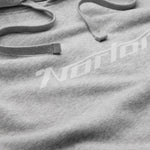 Made from 100% Organic Cotton, this is a back brushed fleece jersey hoodie in grey with a white printed Norton logo on the front.