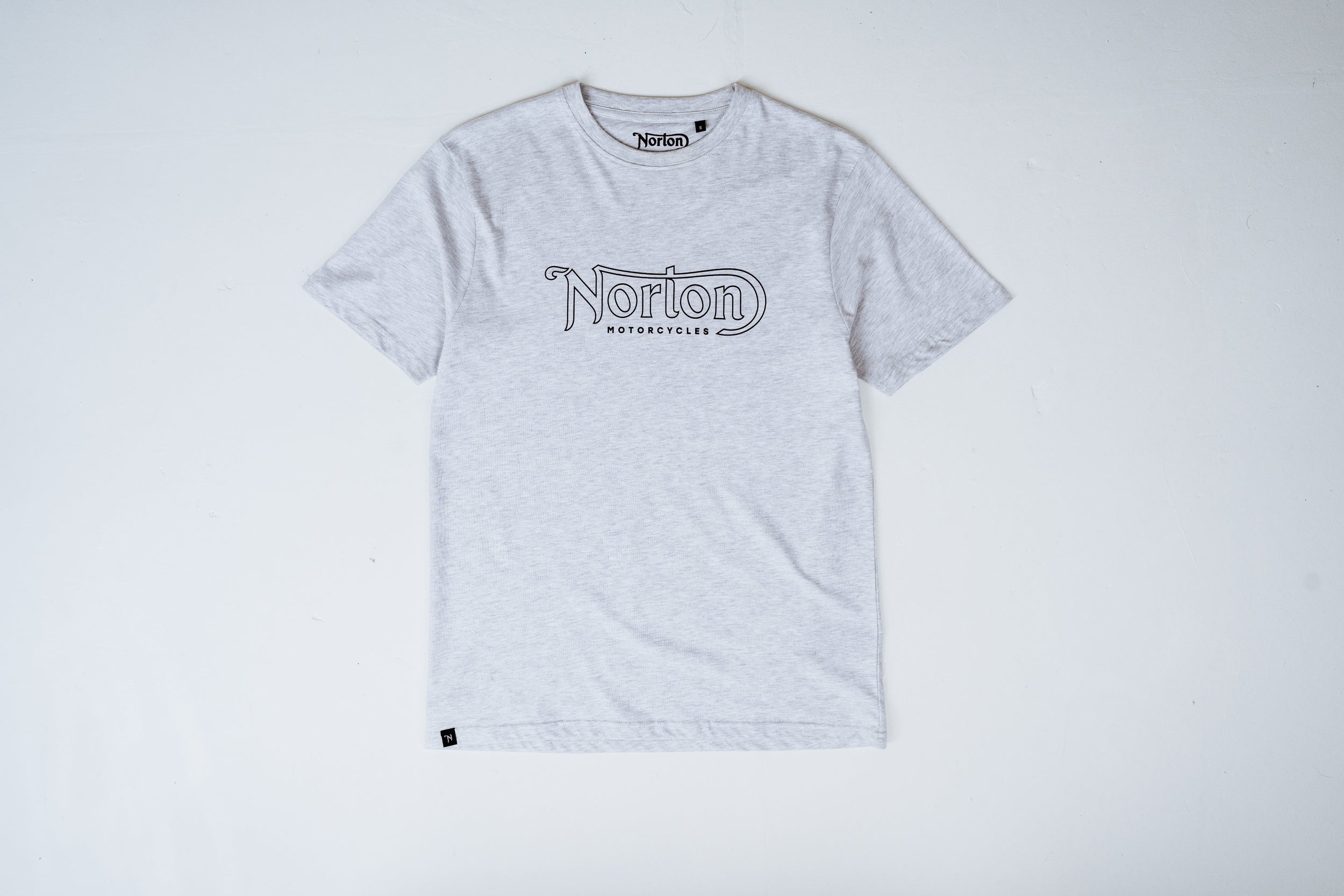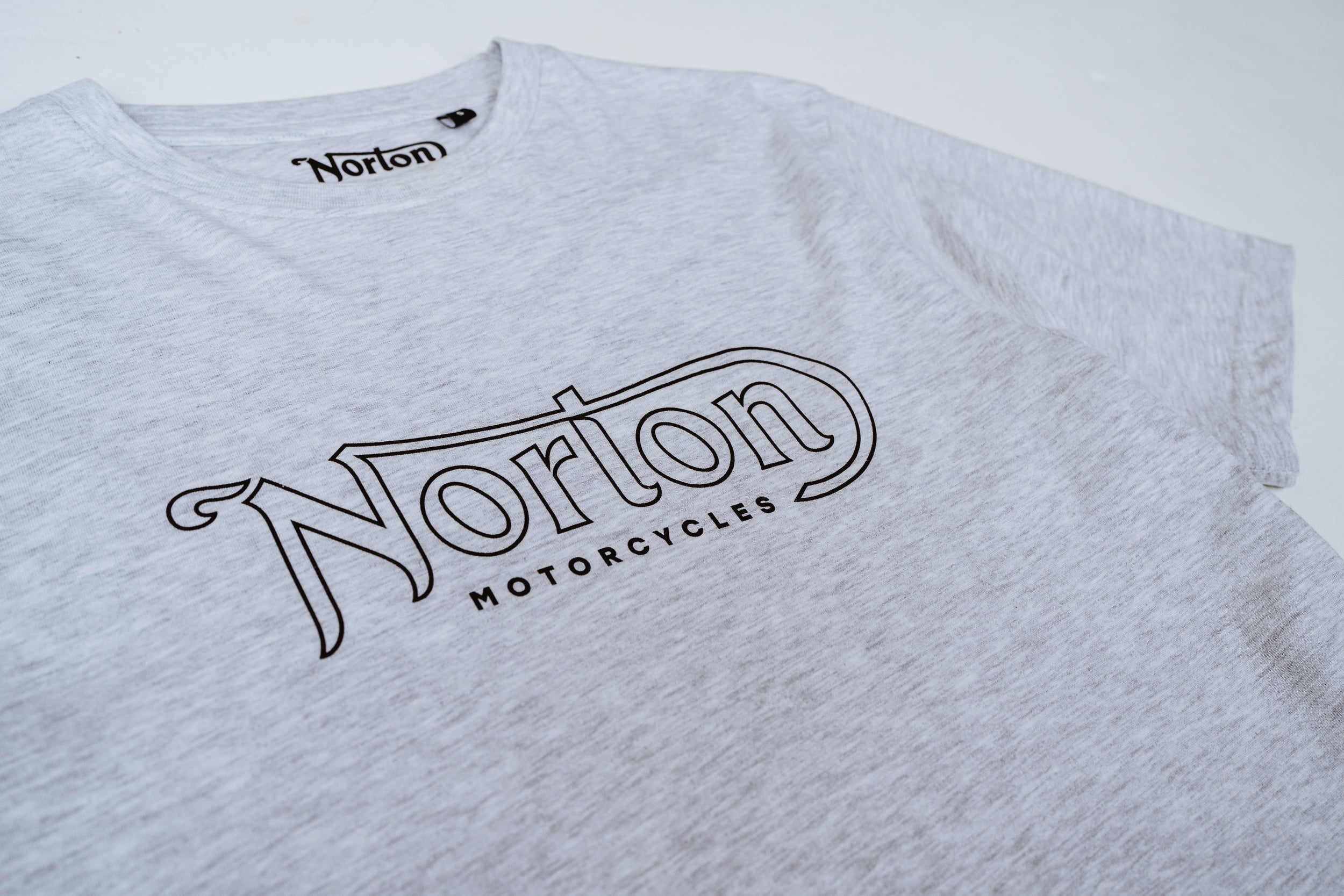Made from 98.5% Organic Cotton and 1.5% Recycled Polyester, this is a single jersey T-shirt in light grey with a black outlined 'Norton Motorcycles' logo on the front.