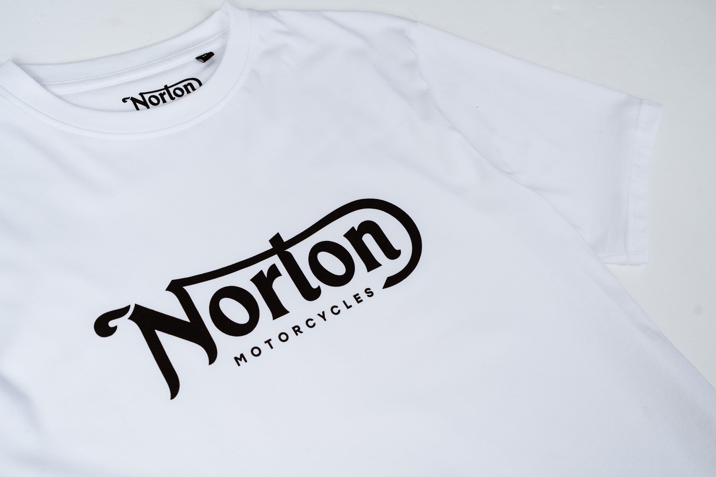 Made from 100% Organic Cotton, this is a single jersey T-shirt in white with a black 'Norton Motorcycles' logo on the front.
