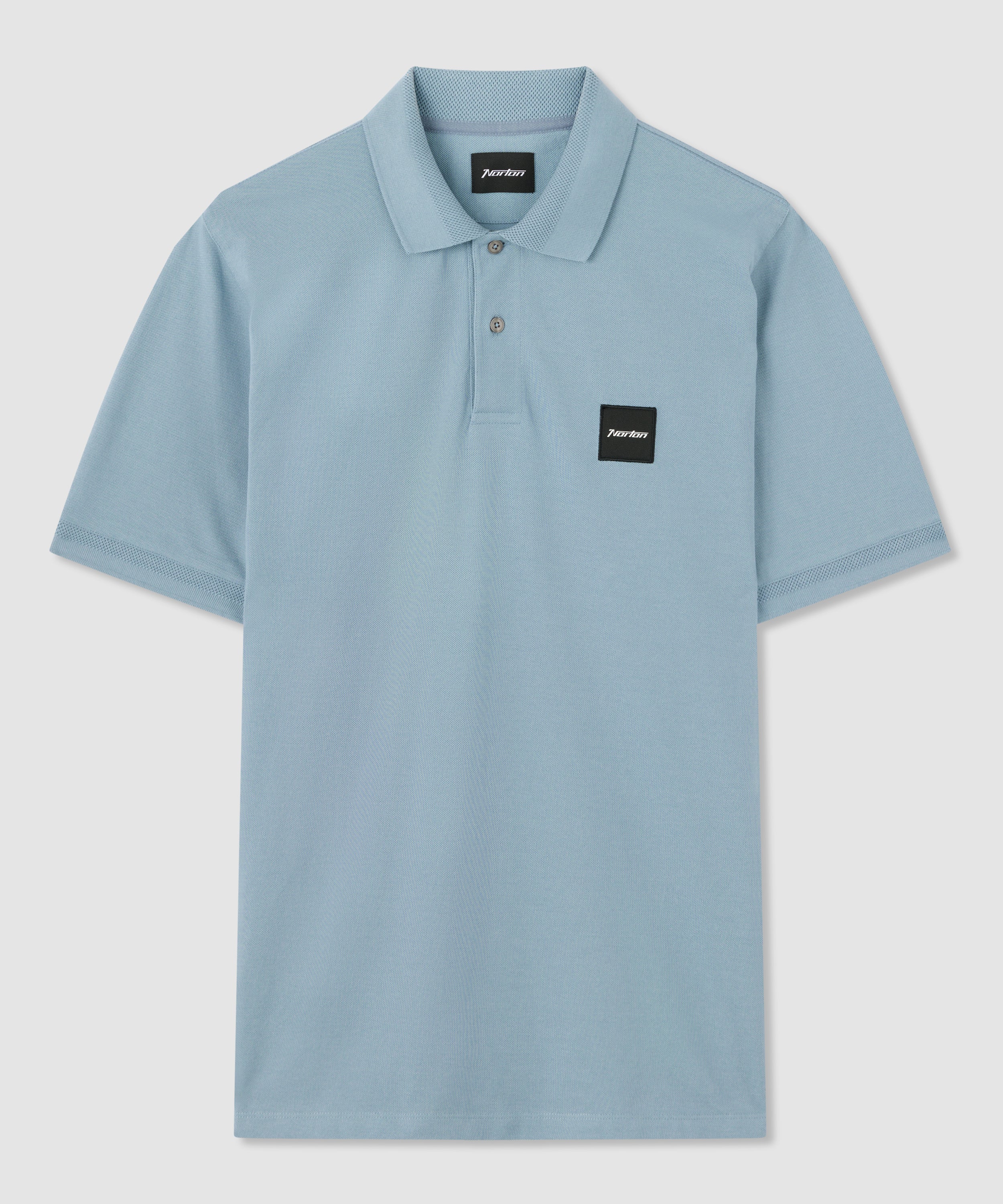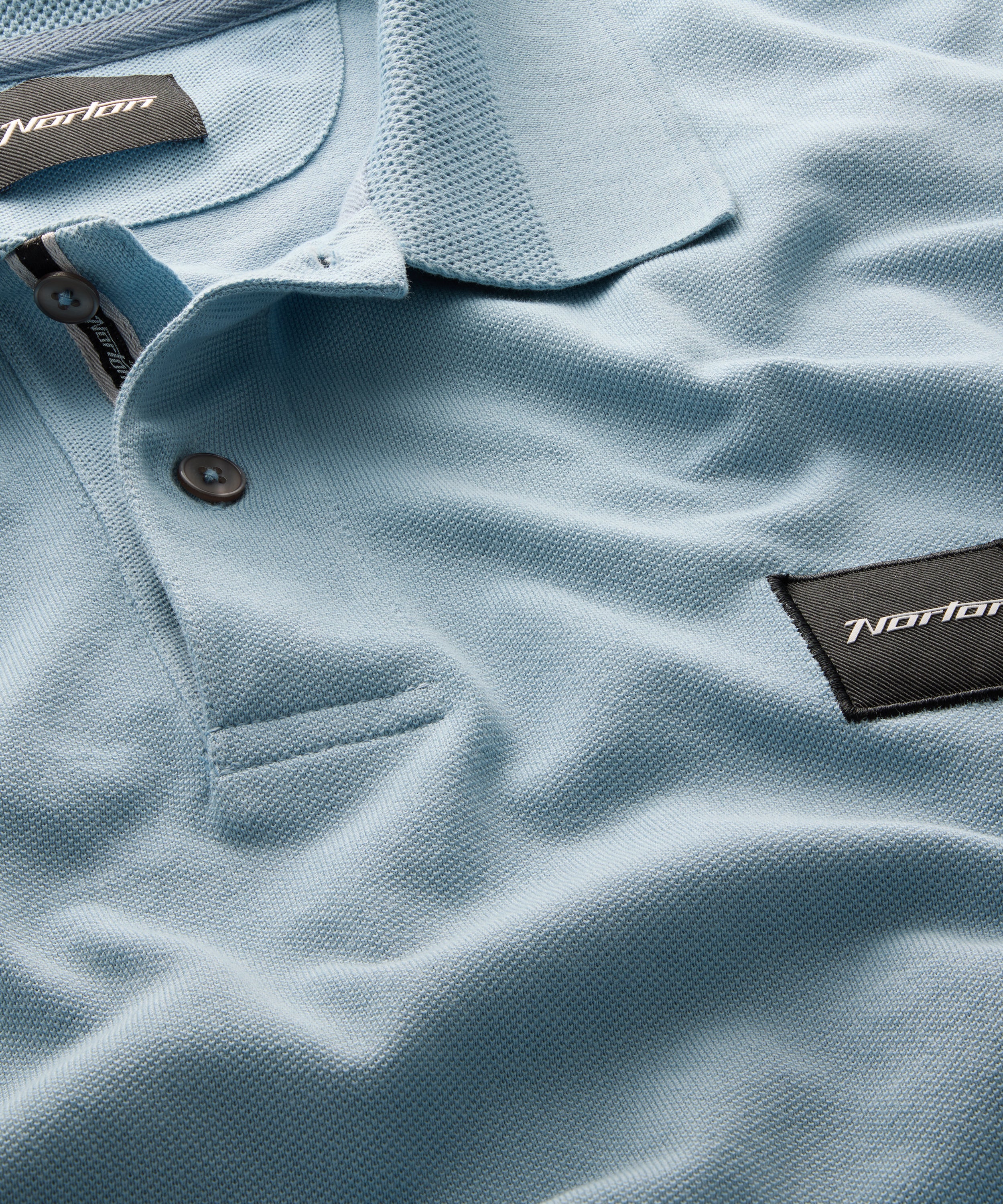 Polo in piqué 100 % cotone blu con piccolo badge Norton ricamato sul petto sinistro.