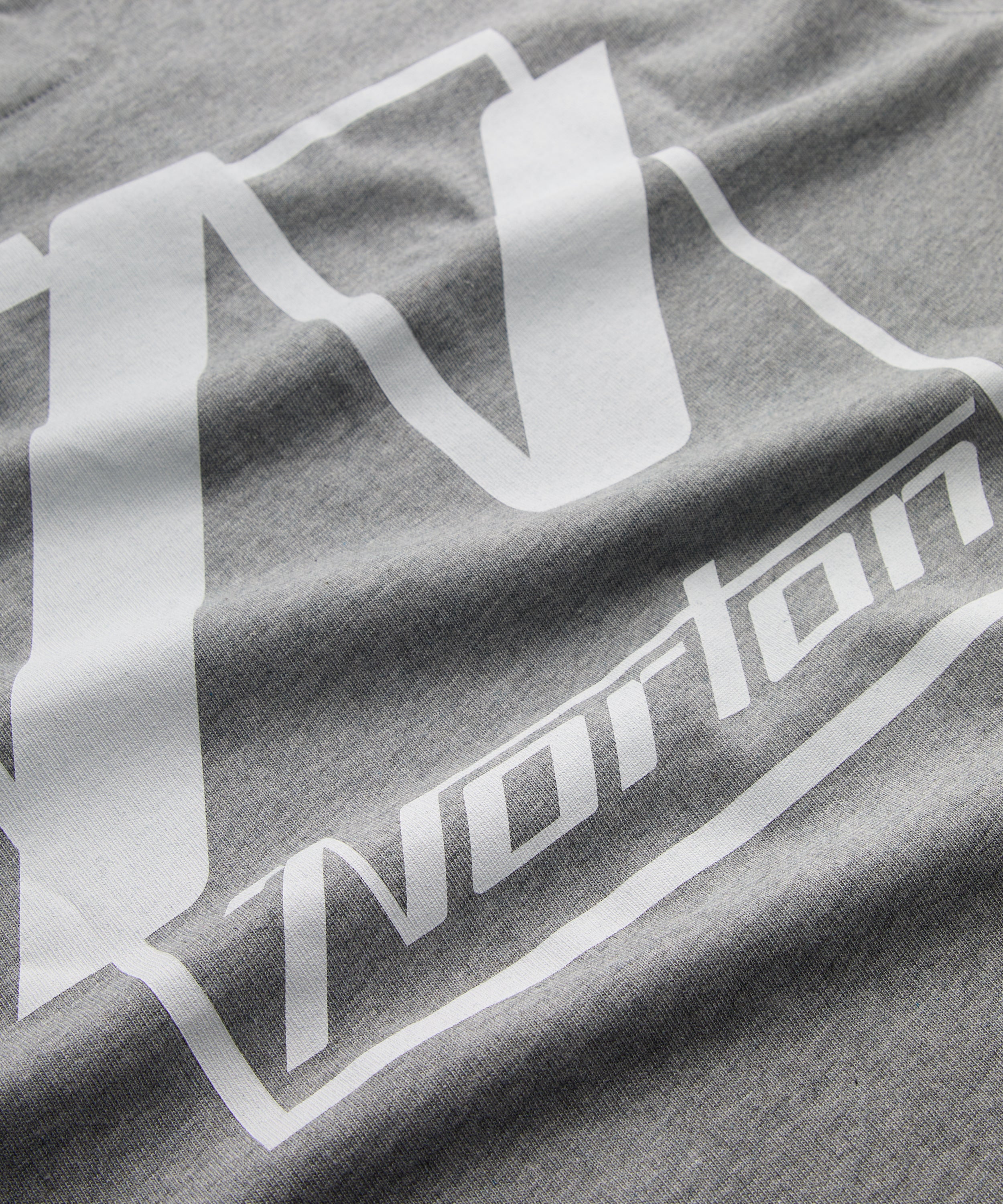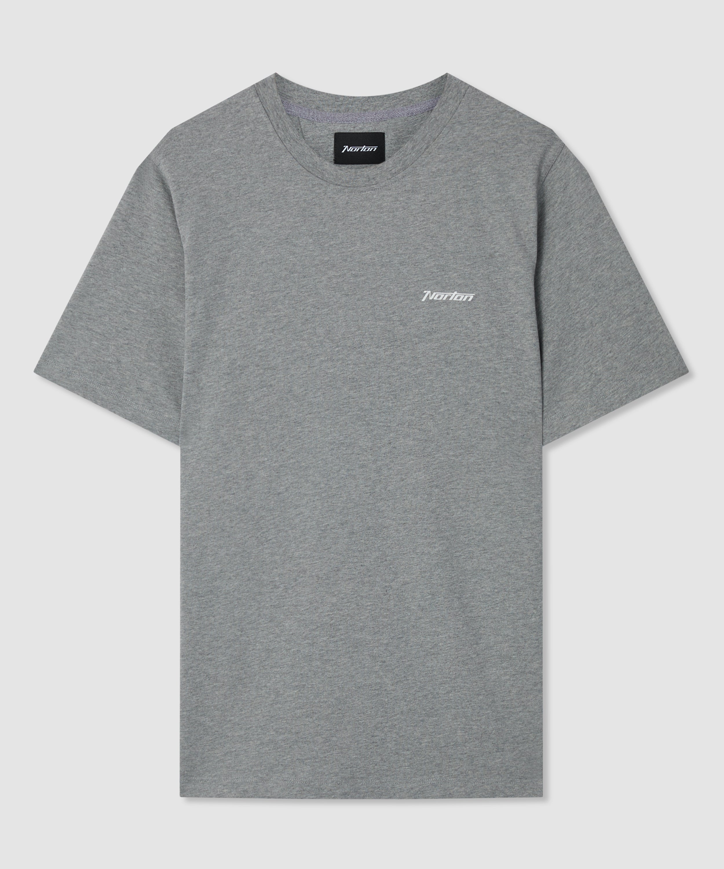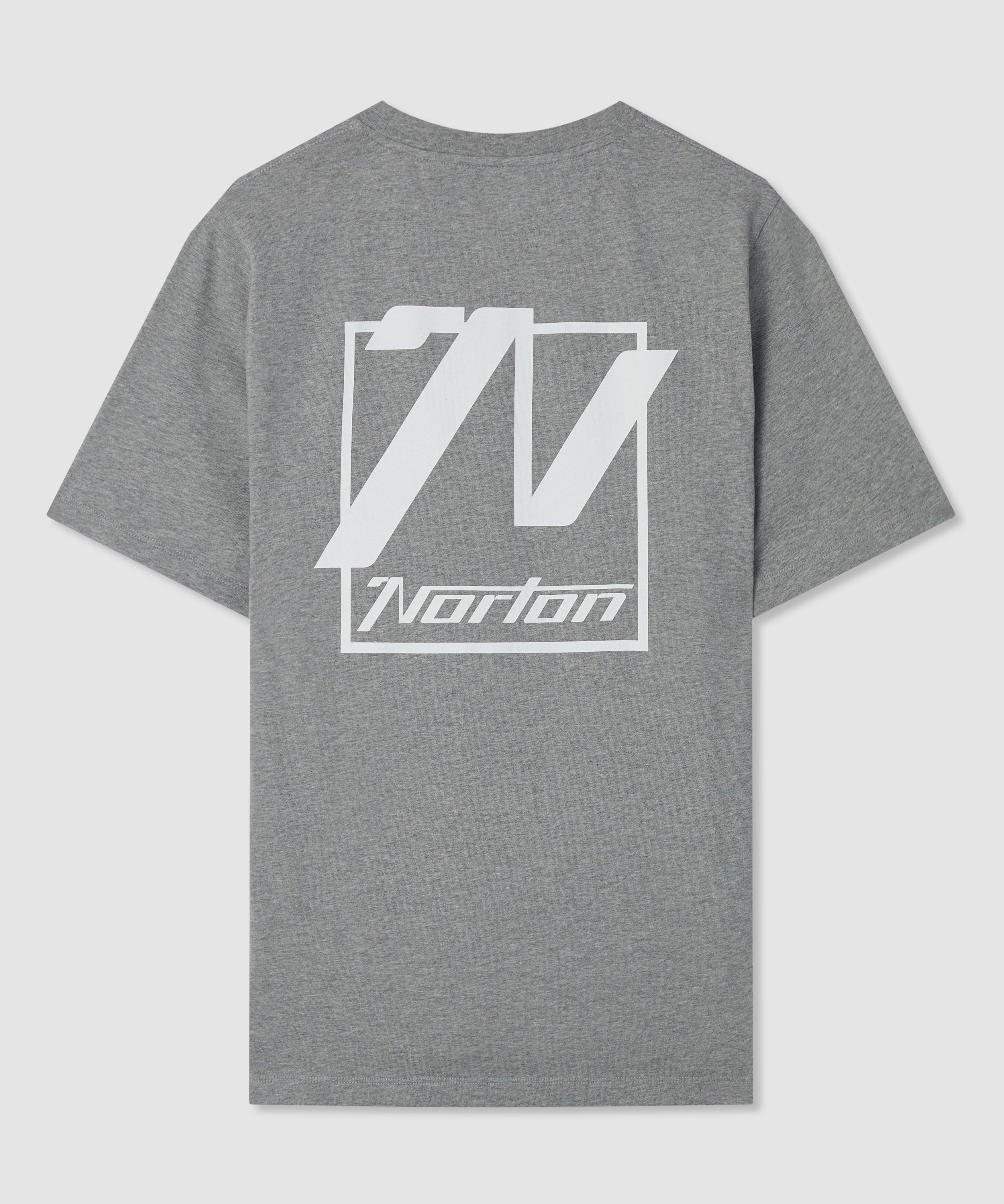 T-shirt a maniche corte in single jersey 100 % cotone grigio mélange, con piccolo logo Norton stampato sul petto sinistro e ampia grafica serigrafata sul retro.