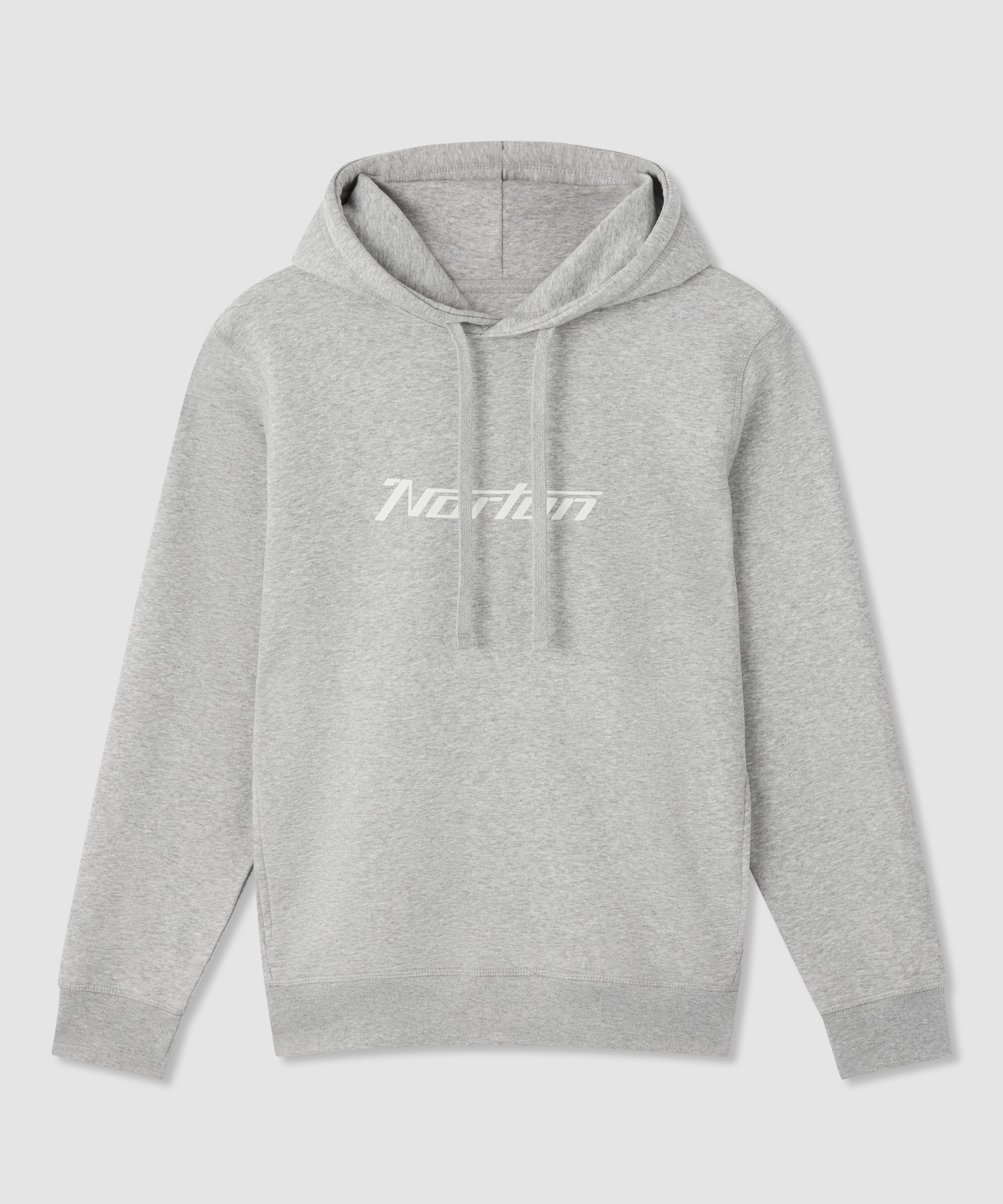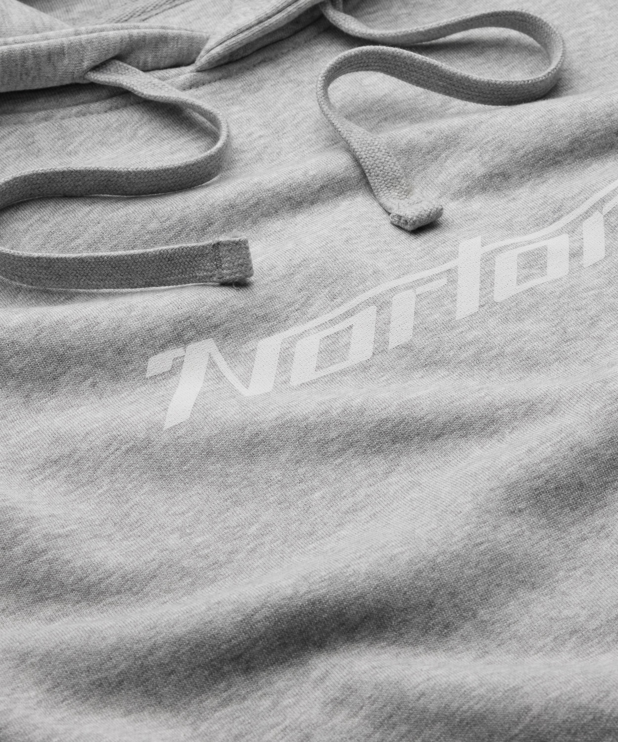 Realizzata al 100% in cotone biologico, questa felpa con cappuccio in jersey felpato sul retro è grigia con un logo Norton stampato in bianco sul davanti.