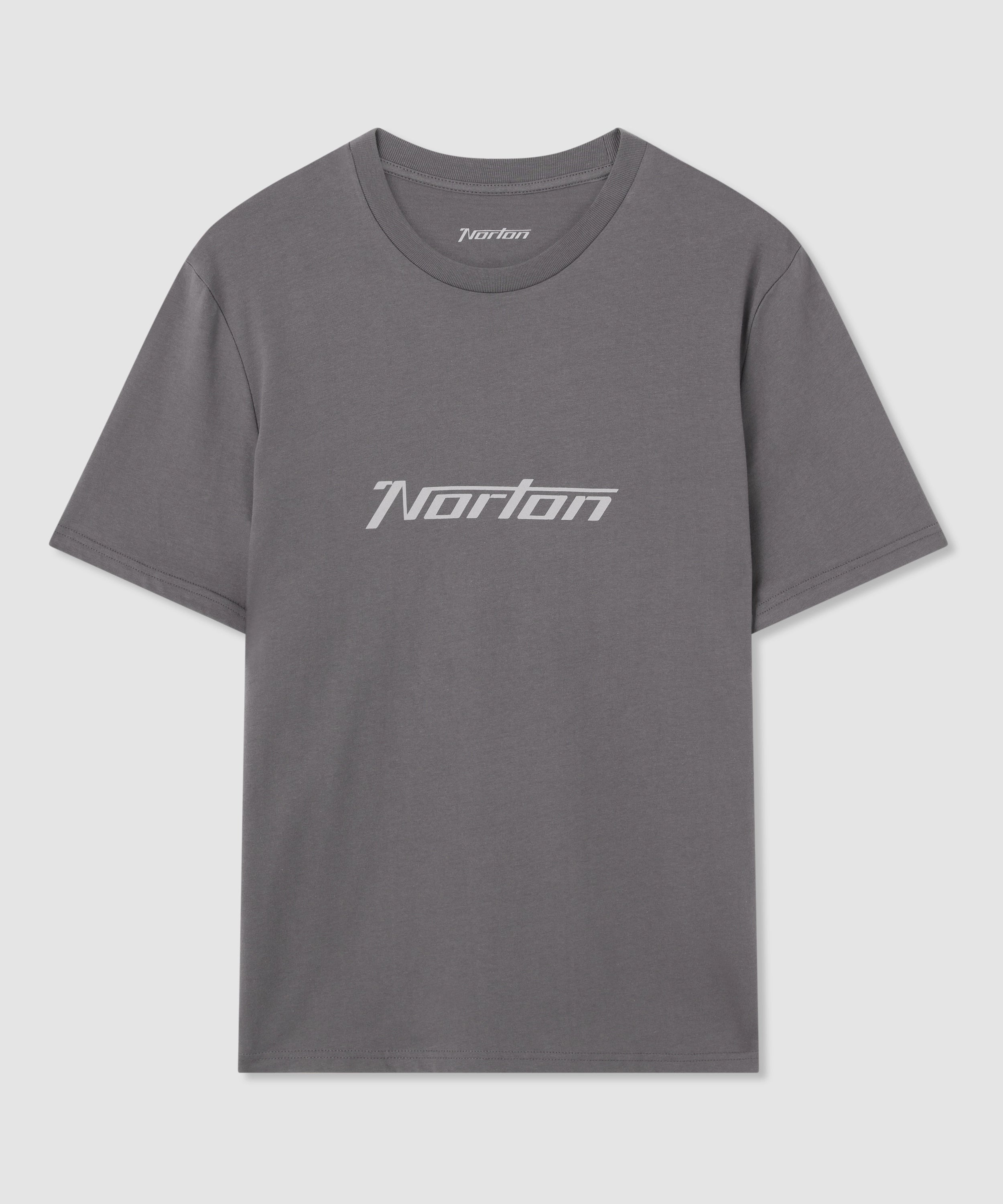 Realizzata al 100% in cotone biologico, questa T-shirt grigia di medio peso in jersey a maniche corte presenta un logo "Norton" stampato in nero sul petto.