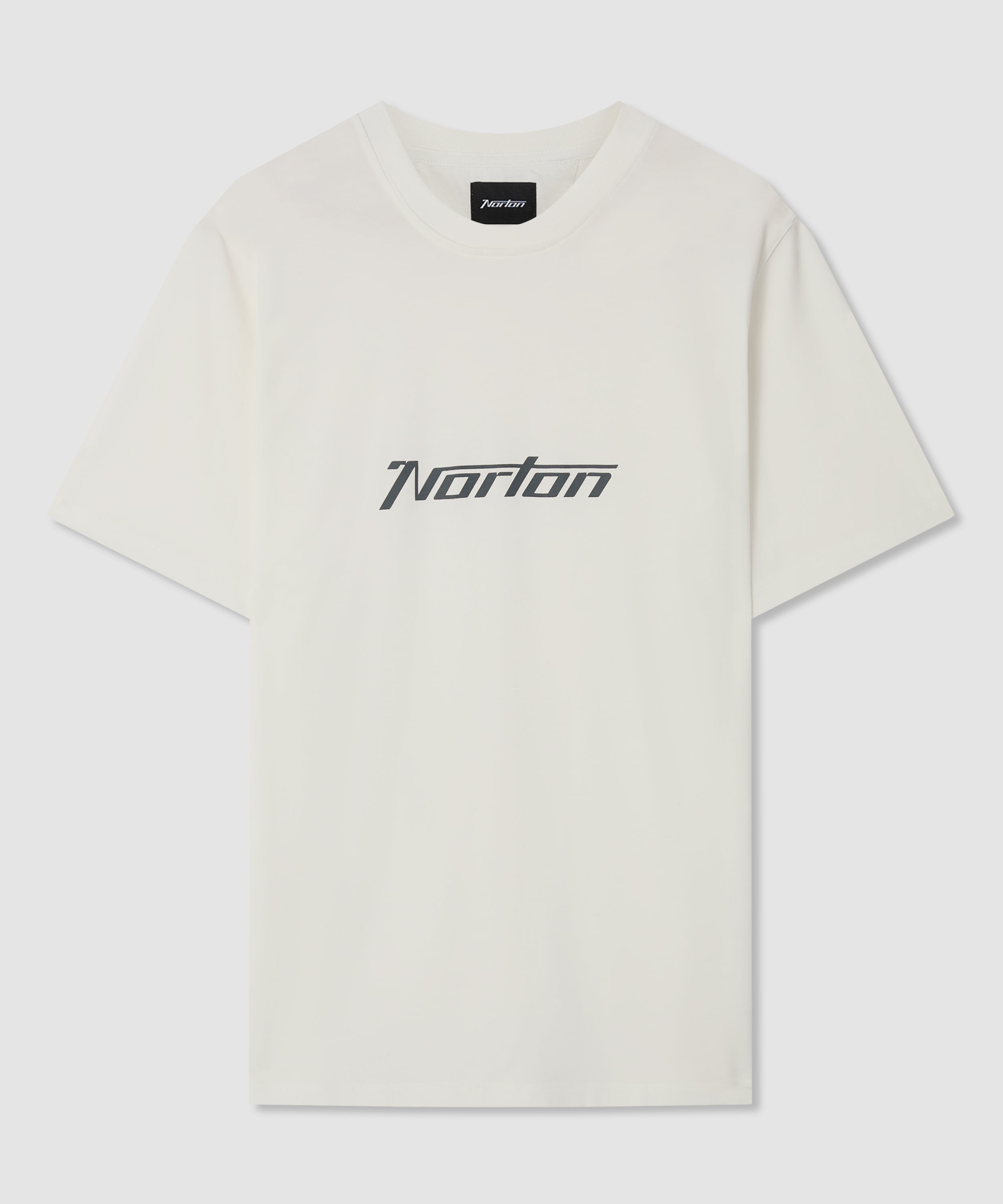 Realizzata in 100 % cotone, questa t-shirt bianco panna a maniche corte e peso medio presenta il logo “Norton” stampato sul petto.